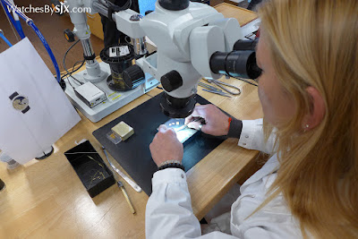 Für die Ronde Louis Cartier XL Filigran Panther Zifferblatt, die Drähte sind verdreht und gerollt, dann gekräuselt und in kleine Ringe geschnitten, bilden die Elemente, aus denen sich der Körper der Panther. Der Filigran wird dann mit schwarzen Lackflecken und Diamanten verstärkt, mit grünen Smaragden für die Augen. Von Anfang bis zum Ende dauert das Zifferblatt einen Monat.
